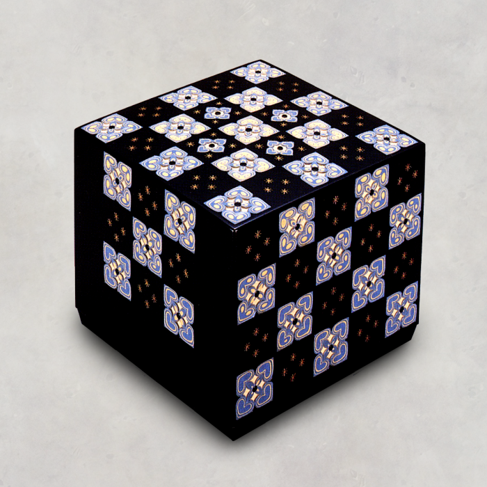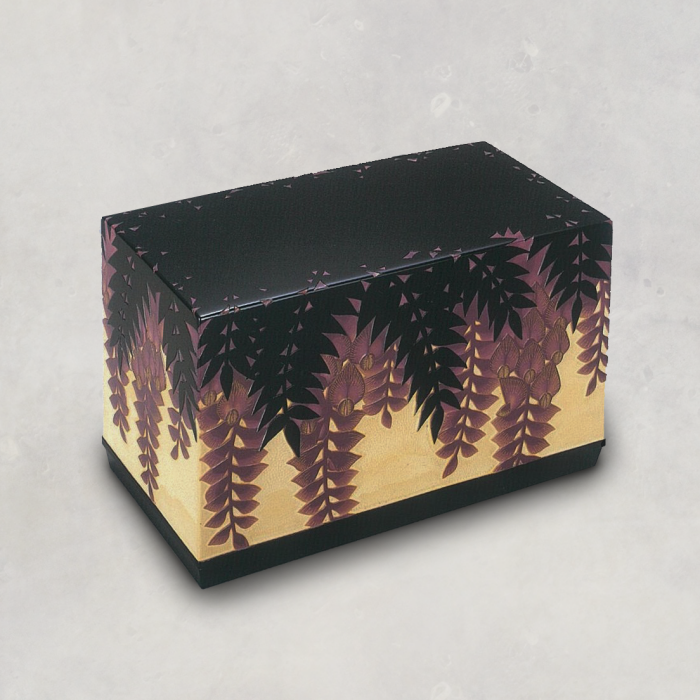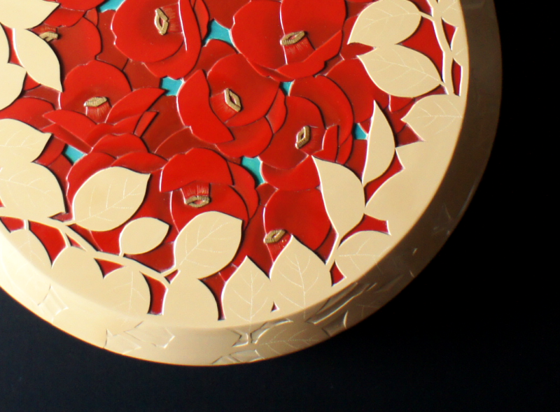After considering a completed design, colored urushi is painted over and over, carved down to the appropriate color, and polished to finish.