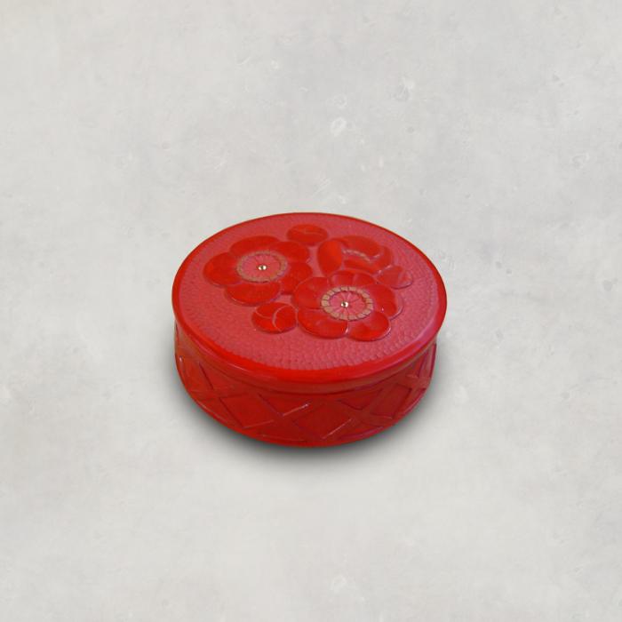 The design in which layers of red urushi is applied on top of layers of green urushi and carved, is called "Kokaryokuyou" (red flowers and green leaves).