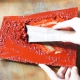 The shrunken surface was peeled off with a spatula by applying acetone, and the hardened areas were removed by grinding. Even though the surface appears to have hardened, the lacquer applied over it will also shrink again, as if pulled, so all the shrunken areas should be removed.