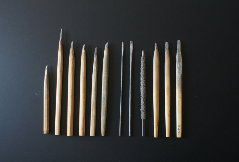 おおまかに線彫りと点彫りの2種類があり、蒟醤剣も線彫り用と点彫り用を用意します。