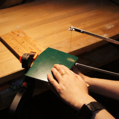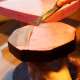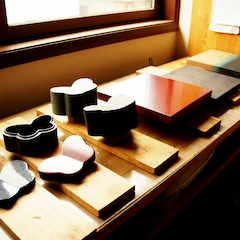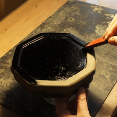 After jinoko-sabi has dried and hardened, I use a piece of whetstone for water polishing, and then shape the surface before proceeding to the next process (hemp cloth application).