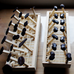 I made those sieves before and they were made of two types of thin metal mesh sheets, #100 and #120, cut and affixed to the tubes and hardened with urushi (Japanese lacquer).