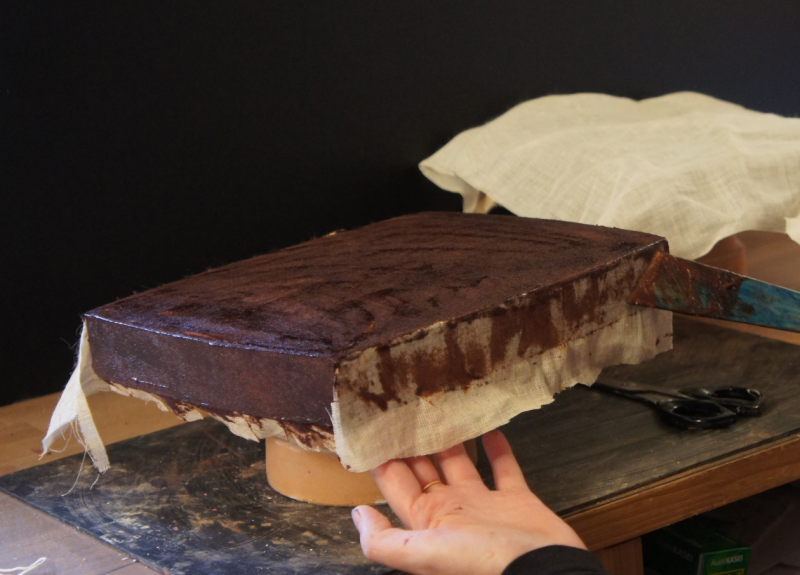 The linen cloth application and mezuri were repeated once a day for a total of 6 sheets of linen cloth. Where thickness was needed in certain areas, such as the bottom and the top of the lid, an extra sheet of coarser linen was applied.