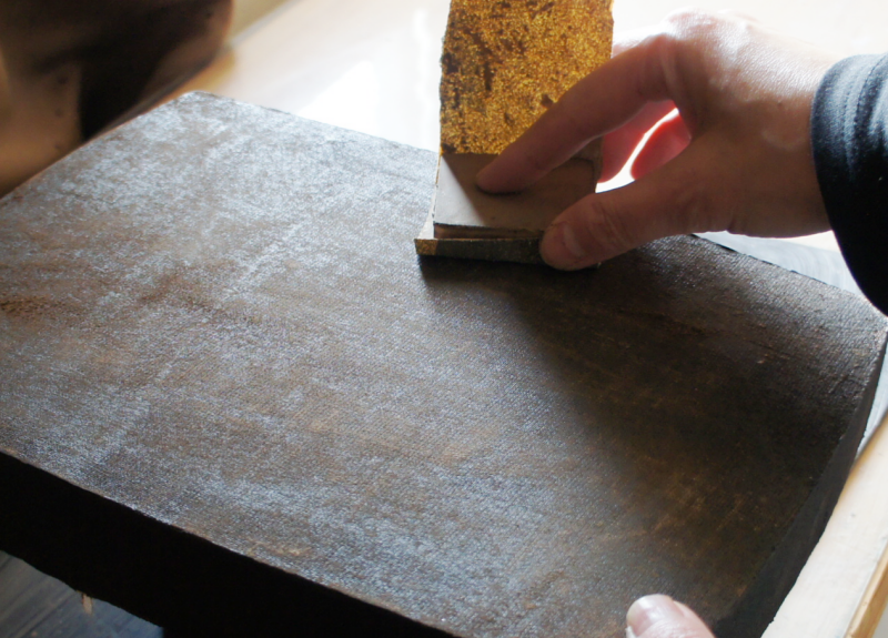 After the glue urushi has dried, lightly flatten the entire surface with sandpaper.